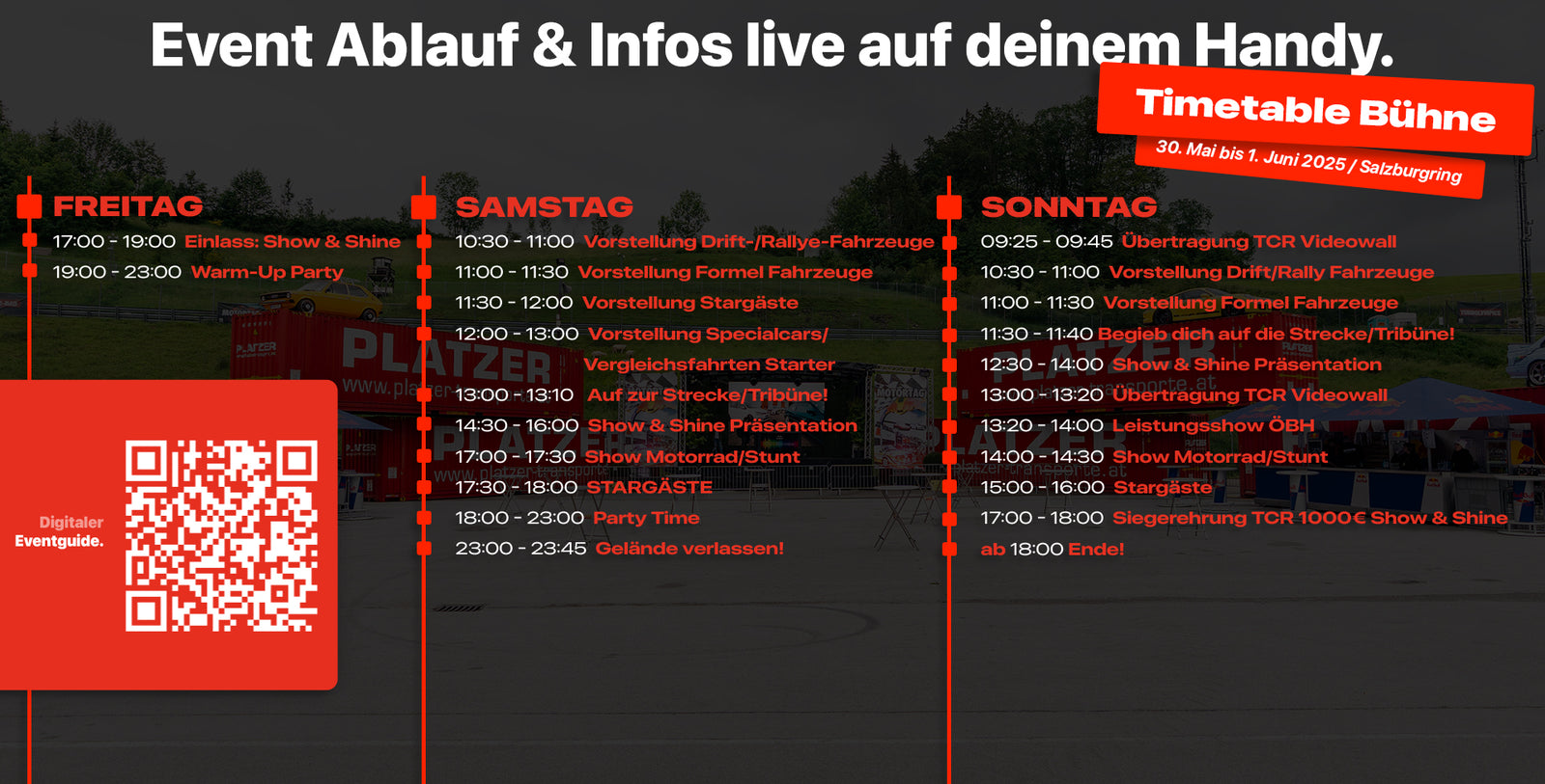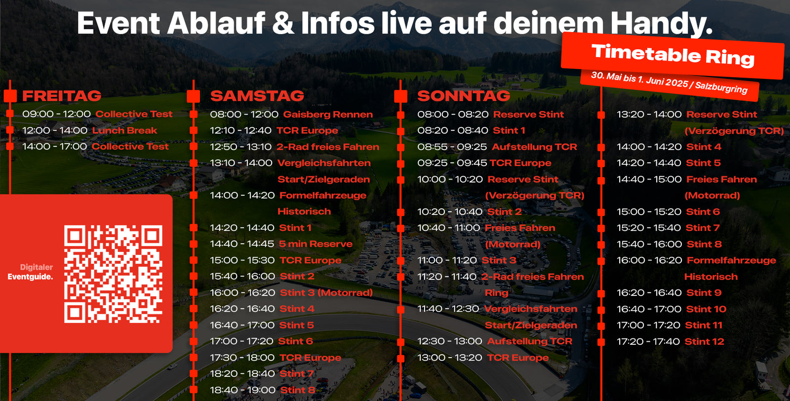 Was ist besser als laute Motoren, Rennsport, Tuning, Rallye, gutes Essen & Getränke, Stargäste und Profis, freies Fahren am Ring, 1/4 Meile Vergleichsfahrten, TCR Europe, Ladeluftclub, Programm für Kinder, Camping, Partys, öffentliche Dienste und Showeinlagen von Polizei, Feuerwehr, Bundesheer?